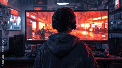A gamer immersed in a vibrant, neon-lit environment, focused on an action-packed screen.
