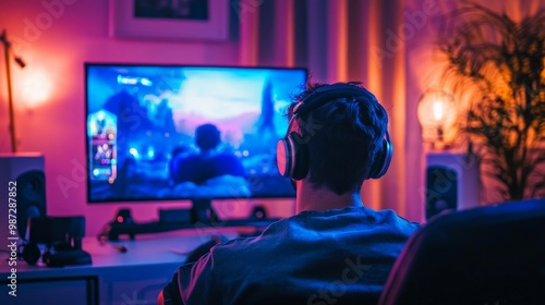 A gaming setup with relaxing ambient lighting, where someone is playing a game designed to promote mindfulness and stress relief.