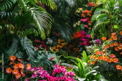 A garden showcasing a diverse array of blooming flowers, creating a vibrant and colorful scene, A vibrant tropical garden filled with blooming flowers and lush greenery