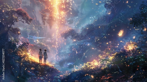 A gay couple standing before an open Pandora's box in a mystical forest, the surrounding area coming to life with magical creatures and ethereal light, their expressions showing awe and amazement