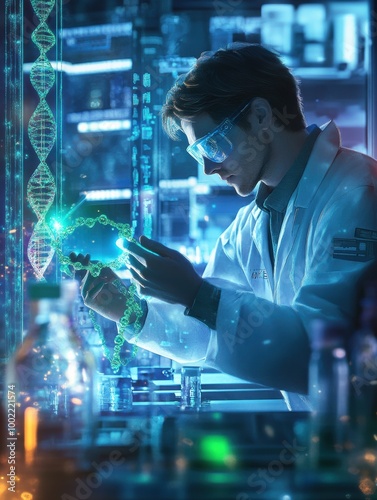 A genetic engineer manipulates floating DNA strands in a futuristic laboratory filled with advanced technology. Generative AI