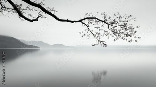 A gentle, peaceful scene of a tree branch hovering over a smooth lake, with the soft rustle of leaves in the breeze.