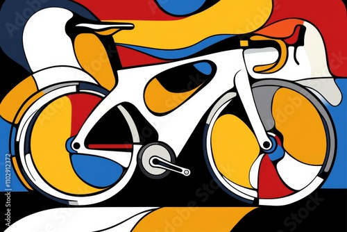 A geometric abstract representation of a bike, using simple shapes and bold contrasting colors