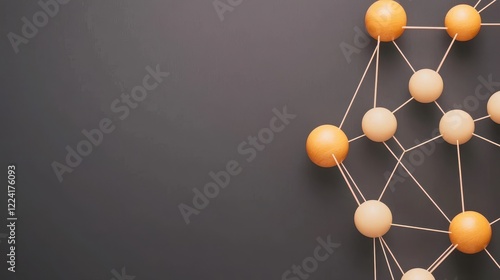 A geometric arrangement of spheres connected by lines, set against a dark background, evoking themes of structure, connection, and science.