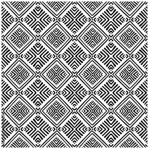 A geometric black and white pattern featuring diamonds and intricate curved lines, creating a stylish and symmetrical design, it could be used as wallpaper, fabric design, pillow or other elements