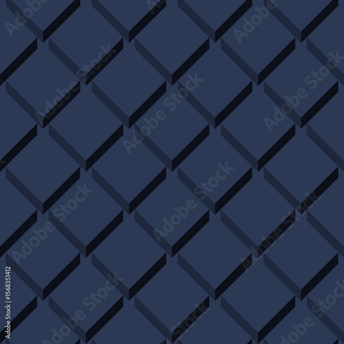 A geometric pattern features a series of interlocking diamond shapes in shades of blue. The consistent repetition and shading provide a sense of depth and symmetry.