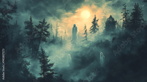 A ghostly figure appears through the dense, swirling mist of a dark and eerie forest. The phantom’s faint outline and the surrounding fog create a hauntingly beautiful and suspenseful atmosphere.