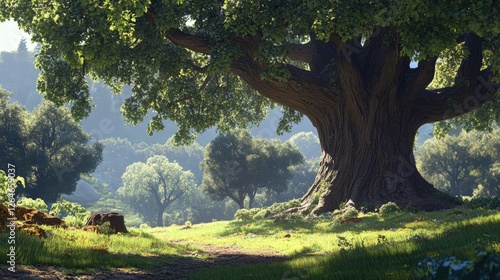 A giant English oak tree with textured bark and thick foliage in a lush green field.