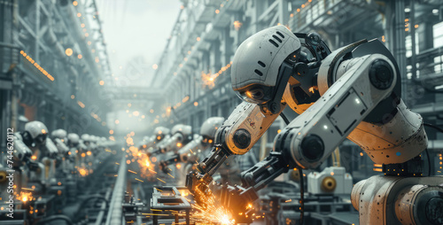 A giant futuristic robotic factory assembly line with towering machines whirring and clanking and sparks flying from welding robots. Generative AI.