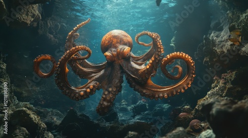A giant octopus spreading its tentacles in a rocky underwater cave