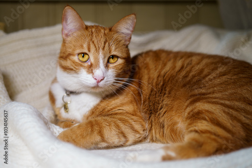 A ginger cat lies gently wrapped in a soft knitted blanket. The photograph radiates coziness, calm and warmth, perfectly conveying the atmosphere of home comfort and serenity.