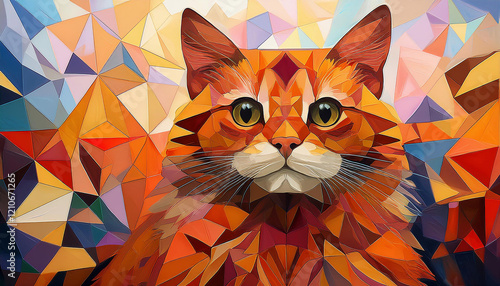 A ginger cat's face is portrayed in a striking geometric style using triangular shapes with vibrant orange, red, and blue tones against a colorful kaleidoscope background.