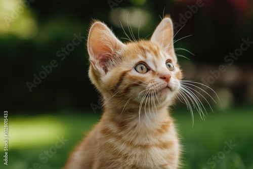 A ginger kitten gazes curiously in a sunny backyard, experiencing nature on a warm afternoon