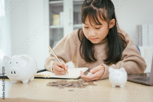 A girl sits at a table, saving money by inserting coins into a piggy bank, emphasizing the importance of building a strong financial foundation for a secure future