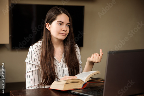 a girl sits in front of a computer and communicates via video communication, explains something and teaches something, distance learning online