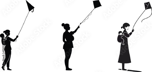 A girl with a kite in the wind, silhouetted against the darkness, evoking a sense of nostalgia, freedom, and childhood memories, suitable for brand logos or stylized graphic elements.