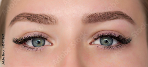 A girl with beautiful green eyes painted with black eyelashes. Close-up of the eyes.