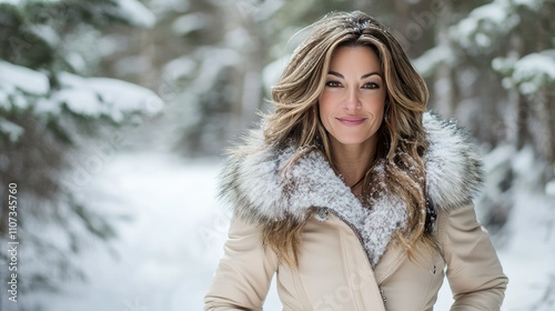 A glamorous winter look featuring a woman in a fur-lined parka walking in a snowy forest trail
