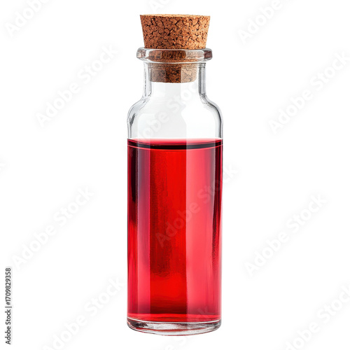 A glass bottle filled with vibrant red liquid, sealed with a cork stopper, showcasing its elegant shape and color.