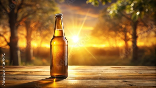 A Glass Bottle of Golden Beverage on a Wooden Table in Front of a Blurred Sunset Background