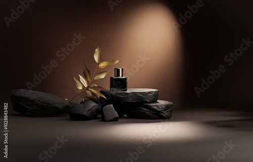 A glass bottle of perfume sits on a black stone platform with a golden branch beside it.