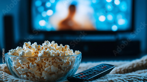 A glass bowl of popcorn sitting on a knitted blanket, a remote control nearby, and a warm, glowing TV screen showing a romantic film in the background.