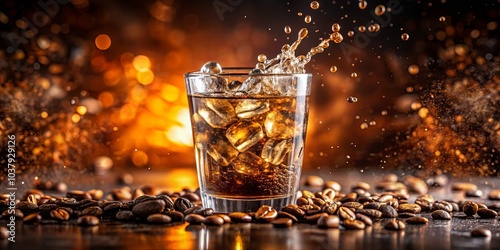 A Glass Filled with Iced Coffee and Surrounded by Roasted Coffee Beans, with a Splash of Coffee and a Bokeh Background