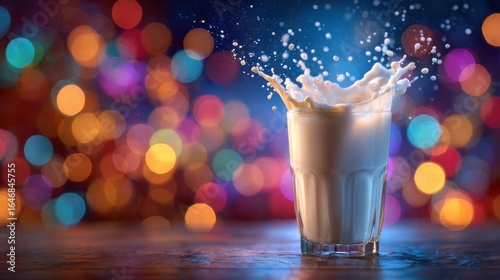 A glass filled with milk has just been disturbed, causing a dramatic splash. The vibrant background is illuminated with colorful lights, creating a joyful ambiance