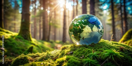 A Glass Globe Representing Earth Resting on a Bed of Lush Green Moss in a Sunlit Forest