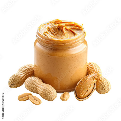 A glass jar filled with creamy peanut butter sits amidst several whole peanuts and peanut shells, creating a visually appealing and appetizing composition