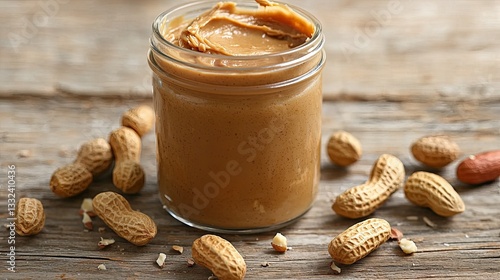 A glass jar filled with smooth peanut butter sits among scattered whole peanuts, emphasizing natural ingredients and rich texture