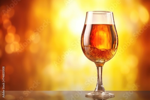 A glass of amber wine set against a golden illuminated background. Amber Wine on Golden Backdrop