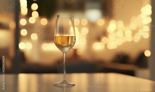 A glass of champagne placed on a minimalist table with blurred golden bokeh lights in the background. Elegant tones emphasize celebration,