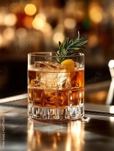 A glass of craft cocktail with a beautiful garnish, placed on a sleek bar counter with elegant lighting, creating a sophisticated and refined drink