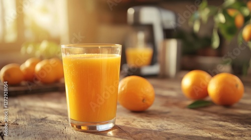A glass of freshly squeezed orange juice sitting on a rustic wooden table, with a few whole oranges and a juicer in the background, evoking a refreshing feel.
