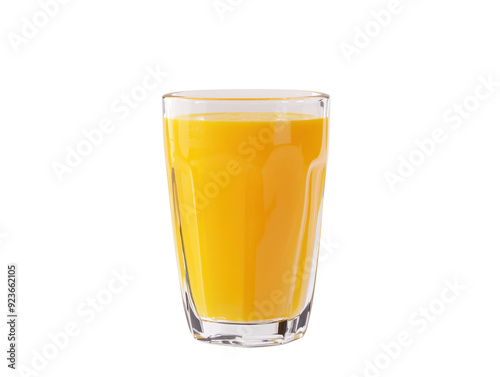 A glass of freshly squeezed orange juice with a slice of orange on the rim cut out transparent isolated on white background PNG file