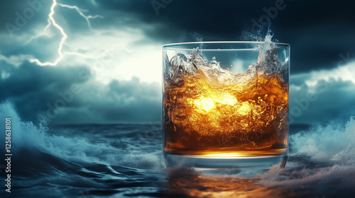 A glass of golden rum with a violent ocean storm forming inside, complete with towering waves and flashes of lightning