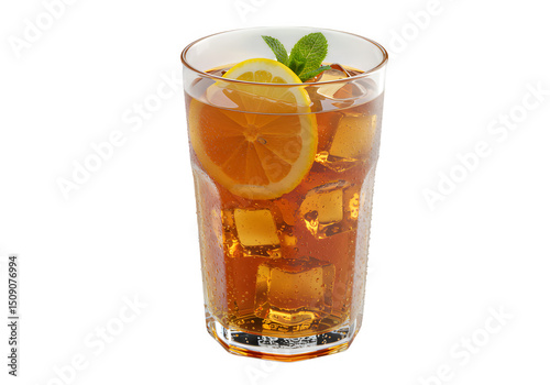 A glass of ice tea with a lemon slice and mint leaf, isolated on white or transparent background. PNG