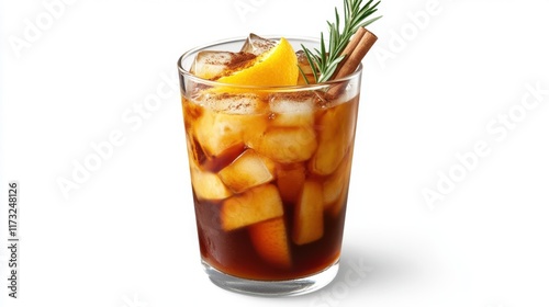 A glass of iced Americano layered with orange and lemon juice, garnished with fresh rosemary and a cinnamon stick, against a clean, white background.