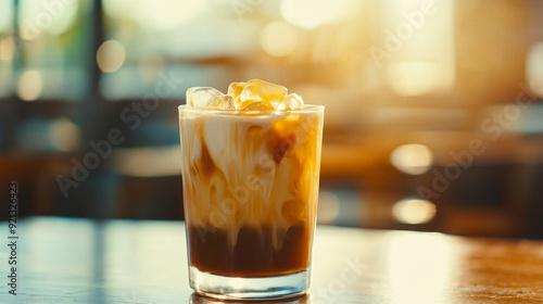 A glass of iced coffee with cream milk, featuring a cold brew coffee drink with ice, bathed in early morning sunlight. The scene highlights the refreshing nature of the drink, with ample copy space to