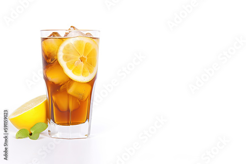 a glass of iced lemon tea with a slice of lemon isolated on white background with copy space. Created with Generative AI Technology