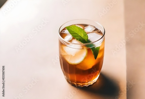 A glass of iced tea with lemon slices and a mint leaf garnish