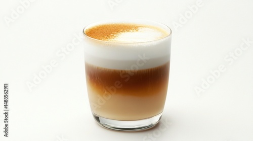 A glass of latte with a thick layer of foamed milk, a brown layer of espresso, and a bottom layer of milk, all against a white background