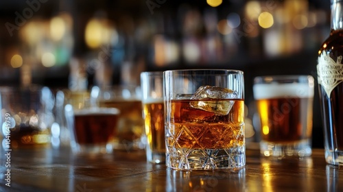 A glass of liquor with ice in it sits on a bar. There are several other glasses of liquor on the bar as well