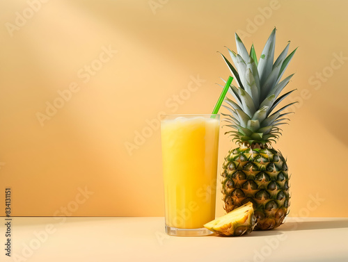A Glass of pineapple juice with slice of pineapple, Refreshing and healthy pineapple juice ice in a glass with summer background, pineapple juice photo