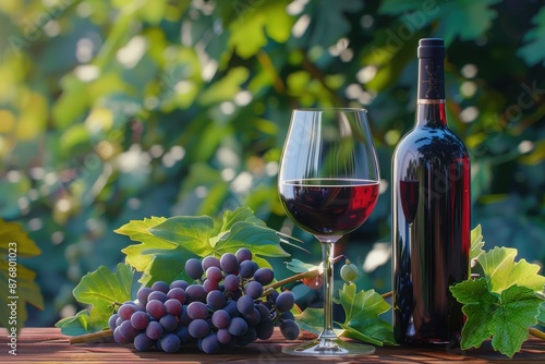 A glass of red wine and a brush of grapes on a wooden table, in a garden with a vine. wine bottle and cup with grapes. Ultra realistic. Photorealistic