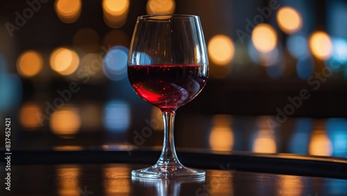 A glass of red wine on an elegant dinner table with warm bokeh lights in the background