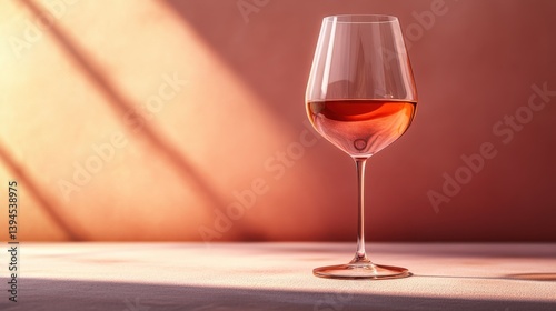 A glass of rose wine casts reflections in soft light, showcasing its delicate color against a warm, minimalistic background.