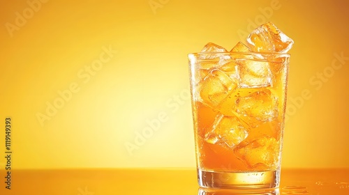 A glass of vibrant orange juice with ice cubes, against a warm gradient orange to yellow background