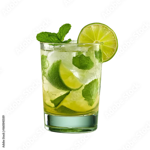 A glass of water with ice, lime slices, and mint leaves, transparent png